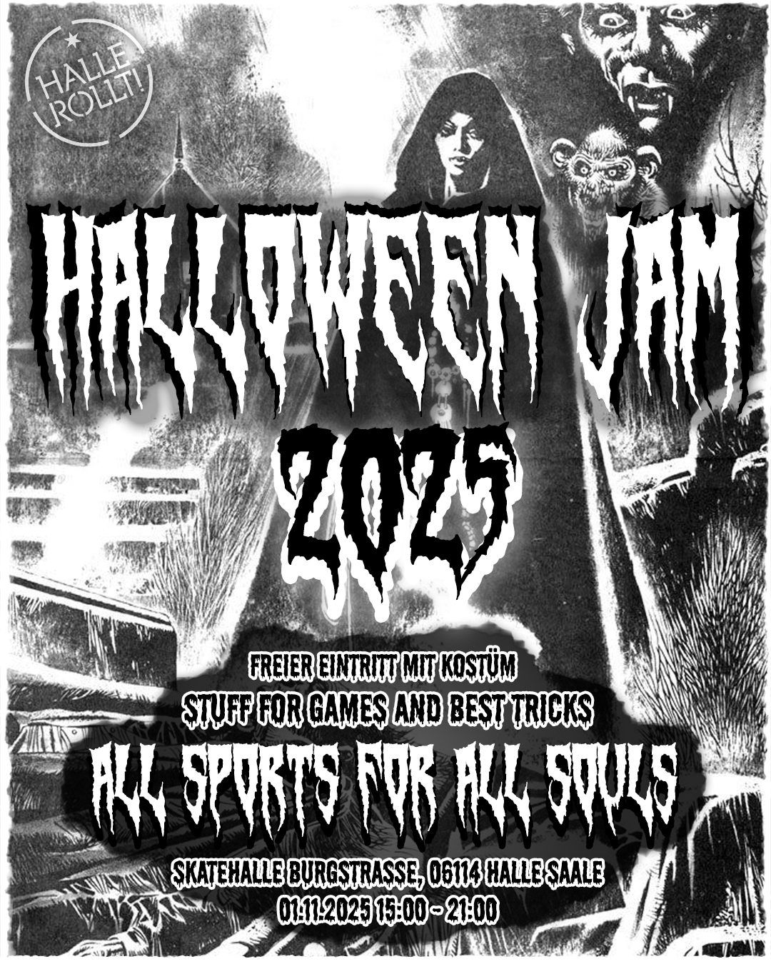 Alle Menschen und Rollsportarten sind willkommen. Es gibt Spiele mit Gewinnen für alle Level. Außerdem: Musik, gruselige Dekoration für Halloween und ganz wichtig: Ihr und eure Kostüme.